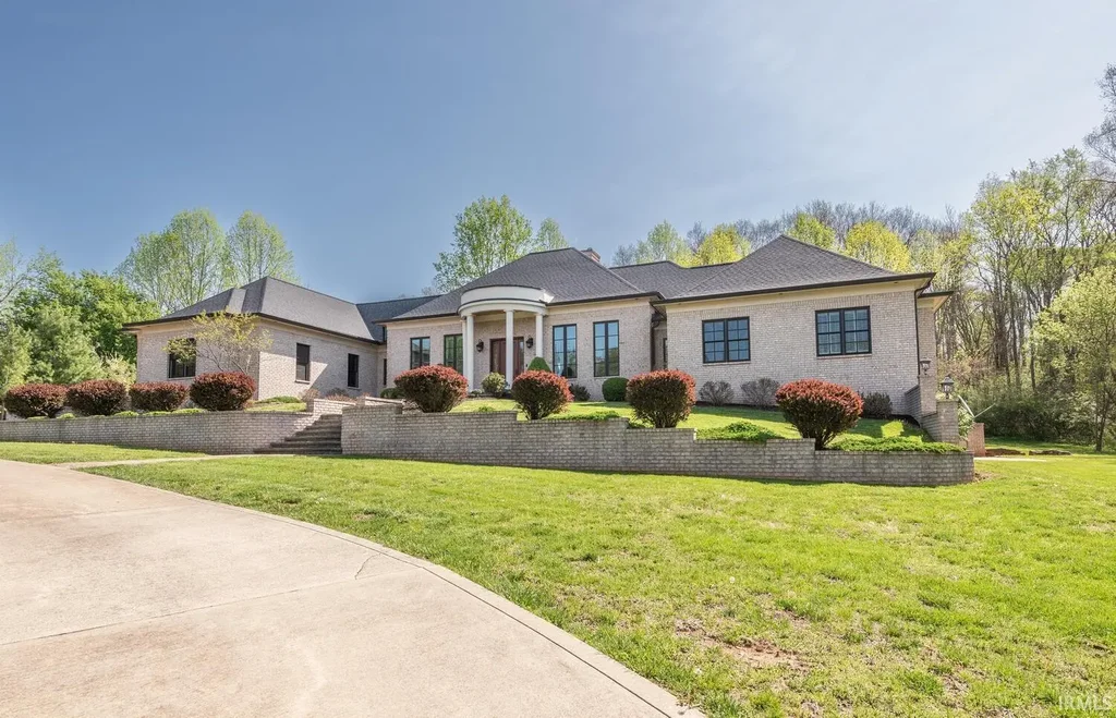 This exceptional luxury residence blends timeless elegance and modern sophistication. Nestled on a serene, more than 2.5-acre parcel, this custom-built brick estate is bordered by 39 acres of county-owned wooded land, ensuring unparalleled privacy and a natural backdrop of tranquility. The interior displays masterful craftsmanship and premium finishes throughout. The main living spaces feature site-finished white oak flooring, soaring ceilings, and intricate crown molding, all bathed in natural light from oversized windows that frame views of the lush surroundings. Multiple fireplaces offer warmth and ambiance in both formal and informal living areas, perfect for entertaining or quiet evenings at home. The richly appointed, wood-paneled study features built-in bookshelves and a classic hearth, perfect for working or unwinding in style. The spacious laundry room is thoughtfully designed with custom cabinetry and an integrated office space ideal for remote work or organization—framed by peaceful wooded views that make even everyday tasks feel elevated. The heart of the home is a chef’s dream kitchen outfitted with high-efficiency, state-of-the-art appliances, custom cabinetry, and refined finishes. Seamless indoor-outdoor flow invites you to enjoy peaceful mornings or sunset gatherings on the expansive patio, embraced by mature trees and natural beauty. First floor living is complimented by an almost two thousand square foot walk out basement with nine-foot ceilings, an extra bedroom, full bathroom, wet bar, media/ entertainment area, and copious storage options. This home offers spacious bedrooms, spa-inspired bathrooms, and versatile living spaces, all designed with comfort and luxury in mind. Every detail reflects superior quality and thoughtful design. Located a short drive from Indiana University, Eagle Point Golf Resort, outdoor recreation, and Lake Monroe. This rare offering in Foggy Morning Glen combines the best of refined living and natural beauty.