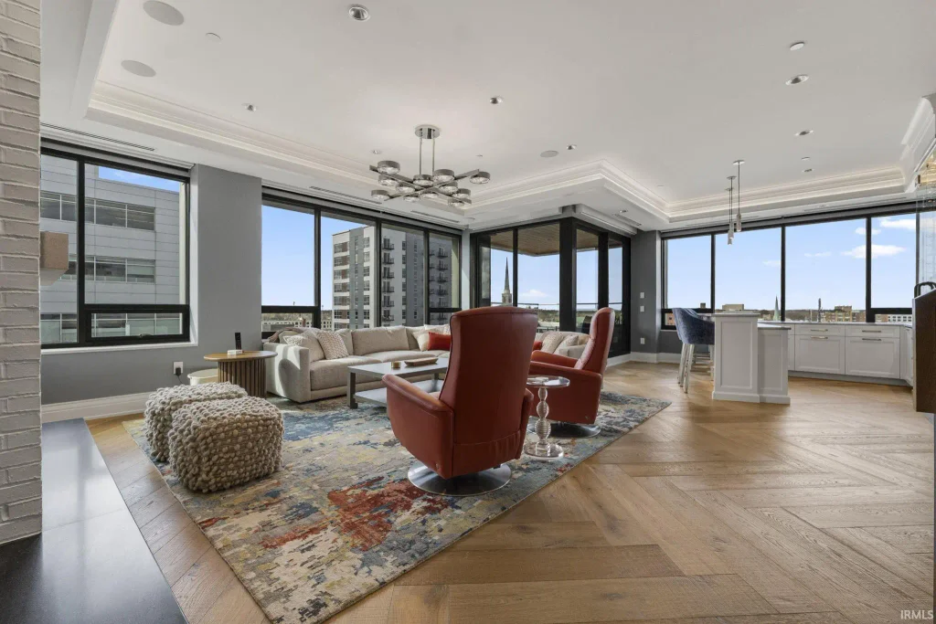 In the heart of downtown Fort Wayne, the renovated Metro building is home to 8 private homes, retail & office space. Park in one of the 4 dedicated slips in the private, secured garage, complete w/EV charging station & car wash suite. Take the keyed elevator to the 8th floor to this luxury high-rise downtown home. The wide-planked wood floors will direct your eyes from the simple, elegant entry to the main living space graced by 10ft ceilings & walls of windows overlooking the city. The living & dining areas, kitchen, wet bar & covered patio make up the main living area w/a show-stopping floating staircase & glass enclosed floor-to-ceiling wine refrigerator, both serving as functional art & conversation starters. No feature has been overlooked in the cabinetry (throughout) by Frank Sauder Designs. Notice the kitchen’s full refrigerator & full freezer, both concealed behind the gorgeous cabinets. The Wolfe cooktop/oven is just one of many high end appliances. The master suite, w/a wall of windows, has the privacy of electric blinds and sun shades (all shade motors throughout the home have been recently replaced). The master bath features a walk-in glass spa with a jetted tub and luxury shower heads. The galley style laundry room is perfectly located, adjacent to the master suite & kitchen. The 2nd bedroom has a walk-through closet and beautiful full bath, connecting to the current media room. With its own walk-in closet, it can also function as bedroom #3, using the bathroom as a jack-and-jill. The home’s upper level (9th floor) boasts of a kitchenette/wet bar with sliding doors that open up to an incredible rooftop patio with a gas fireplace, and also includes a bonus room. The views are fantastic. The patio has direct access to the Metro’s rooftop common area w/an outdoor kitchen, grill, and seating. While surrounded by the city, the home provides a private and quiet living space, with undertones of security throughout. Also, a top-of-the-line Casoro Safe was recently installed. Prepare to be spoiled by the complete smart home Crestron system, with brand new touch screen. Simply hit "Exit" to turn everything off at once on your way out, whether it's just to hit the fitness center right outside your unit, grab a coffee or drink around the corner, or enjoy easy access to all downtown has to offer - The Embassy, Parkview Field, parks, and annual events.