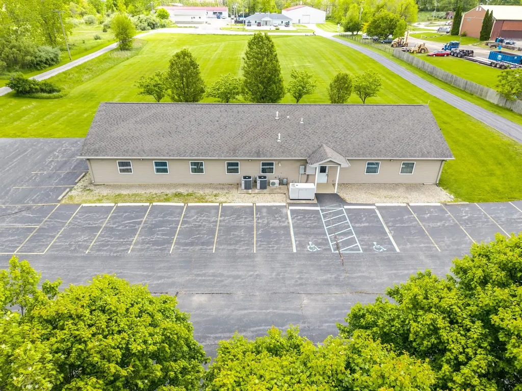 Spacious 4000 sq ft office building on 5.17 Acres that boarders I69. The building is in move-in ready condition. There are 3 bathrooms centrally located. A kitchen area and an office is located in the front along with a large conference area. A second office is located in the rear of the building with a second large conference area. The appliances include; refrigerator, electric stove, microwave & dishwasher. also incudes a generator, generac.