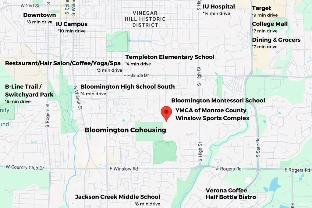 Build your dream home on one of the last remaining lots in Bloomington Cohousing, Indiana’s first Cohousing community, located just north of the SE YMCA. This unique neighborhood features both newly constructed homes by the renowned Loren Wood Builders and lots available for custom builds with the builder of your choice. New homes can be one of several plans already approved for the community. Designed with intention, the neighborhood encourages connection through shared spaces that foster a strong sense of community and shared values. Common amenities include a common house, guest cabin for overnight visitors, community garden, picnic shelter, bike storage, mail kiosk, and parking areas. The common house offers a large kitchen, dining area, laundry facilities for oversized items, storage for residents, and flexible open space ideal for gatherings. Surrounded by green space, including a ten-acre nature conservancy, the neighborhood offers a peaceful setting just minutes from downtown Bloomington, local parks, and Indiana University’s campus.