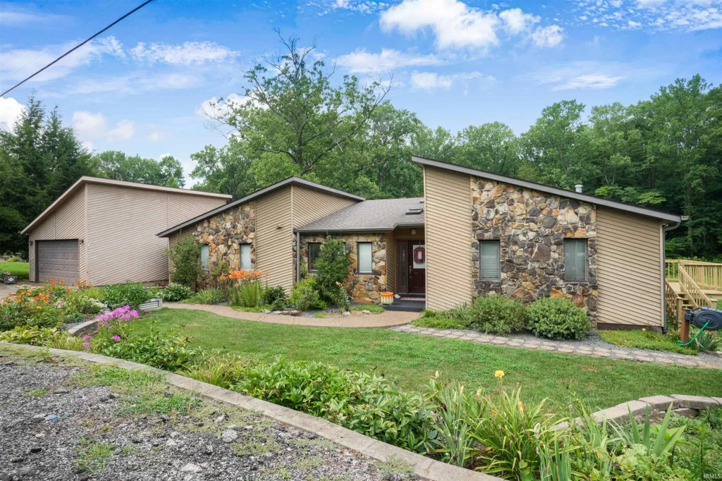 This beautiful Contemporary Ranch style home sits on 3.33 acres while being a convenient, short drive away from all the West side of Evansville has to offer! This home features 4 bedrooms, 3 full bathrooms, and loaded with updated cosmetics and amenities. Step inside and feel welcomed by the beautiful Cathedral ceilings on the main floor which boasts 6 skylights throughout. Looking for more natural light? The living room boasts 3 large picture windows on the northern side and a sliding glass door out to a NEW wooden deck (07/2025) to the west with gas grill hook-up. You will also find a cozy gas fireplace, which was installed in 2023. The kitchen was remodeled in 2021, including installation of Quartz counters, and comes with all appliances which were purchased in 2019. Bedrooms are generously sized and the primary bedroom features an en-suite full bath. All flooring throughout the home has been updated in the last 2 years with the main floor featuring LifeProof vinyl, all exterior doors replaced in 2021, and all light fixtures, both interior and exterior, were replaced in 2020. Every bathroom in the home has been remodeled in the last 2 years. The basement features 2 bedrooms, full bathroom, a den/family room, and walks out to a back patio. New Goodman A/C and furnace, plus an AO Smith water heater installed in 2021. Outside the home you will find a spacious 2-car detached garage, a second large deck overlooking the scenic backyard, and TONS of beautiful landscaping. For those interested in gardening, there are 7 large wooden raised beds and a garden bed off to the side in the backyard, while the front yard features 2 more large raised beds. An abundance of wildlife frequents the wooded property making mornings and evenings extra special when you catch a glimpse or be a great location for someone who loves to hunt. There is a large secondary drive on the southeast corner of the property for additional parking and potential to be further developed with enough space to add an extra garage or pole barn. According to previous owners, the home was originally built in 1930, but was actually rebuilt entirely in the 70’s. This unique and beautiful West side property has so much to offer, so don’t miss out!