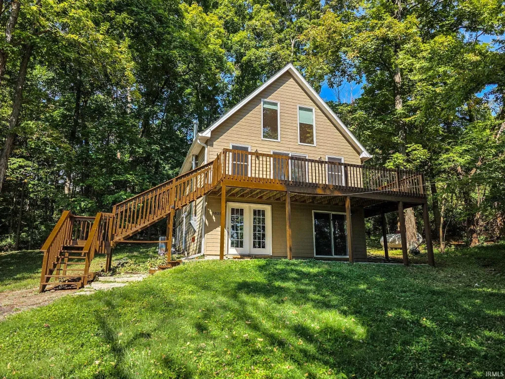 Open House Sunday October 19th, 2:30 pm to 4:30 pm. Experience the charm of country living while being just 6 miles away from Indiana University and downtown Bloomington. This distinctive chalet-style residence, perched on a 1-acre lot, features impressive cathedral wood ceilings. The seller is offering a $5,000 allowance for the driveway. The deck will be stained within 2 weeks. The heating and air conditioning systems were both new in 2023, and a new water heater added in 2024. The main level offers an open layout combining the kitchen, dining area, and great room, all filled with abundant natural light thanks to numerous windows. The kitchen is equipped with stainless steel appliances, a breakfast island with solid surface counter, and ample cabinetry. On this floor, you’ll also find two bedrooms and a full bathroom. Above the main floor, a spacious loft provides versatile space that can serve as a bedroom, a large office, or a game room. The walk-out basement boasts an L-shaped family room with newer wood stove, a fourth bedroom, a den, a full bathroom, and a laundry room. Outdoor features include a sizable front deck, a concrete patio at the front, and a wooden balcony at the back. Additionally, there is a 12’ by 10’ shed and a zip line located on the south side of the property!