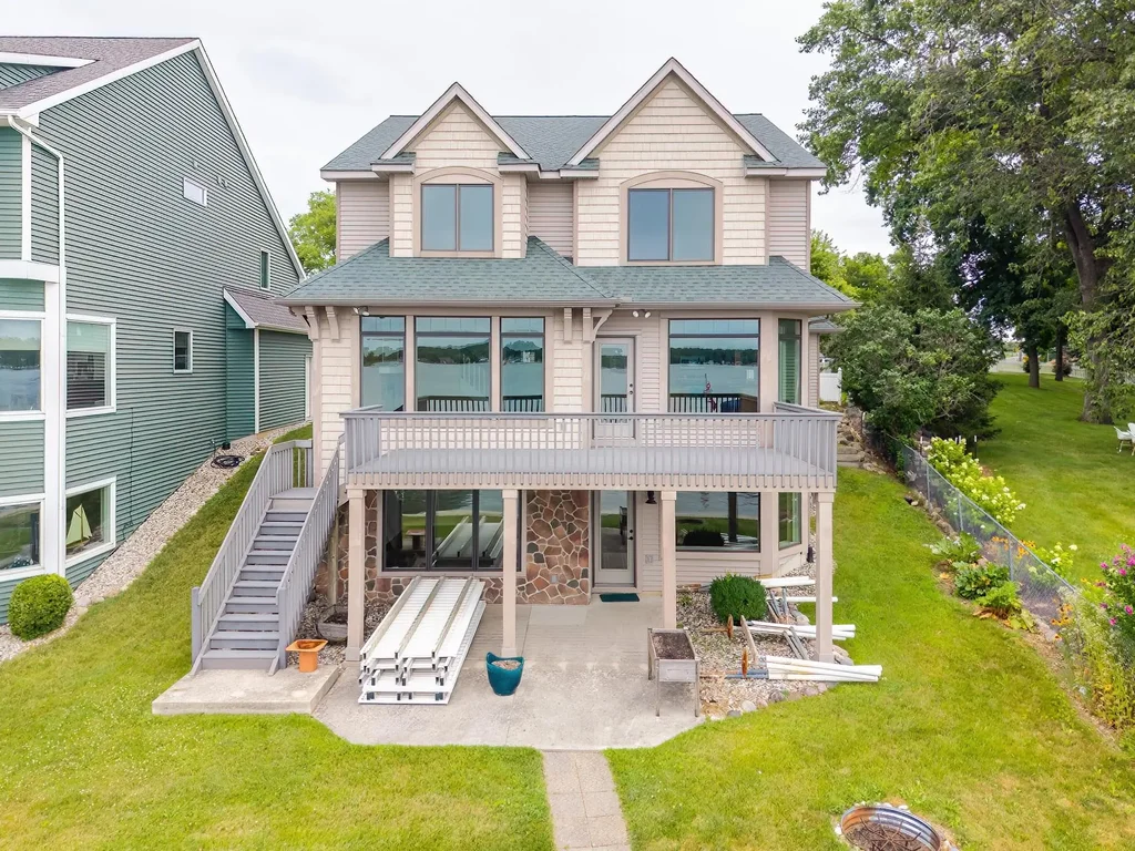 Escape to your own slice of paradise at this stunning lakefront retreat on Crooked Lake's first basin that has a firm sandy beach. Built in 2010 by Bob Buescher Homes, this 3,466 square foot home combines open-concept living with breathtaking water views that'll make your morning coffee taste even better. The heart of the home offers an open concept, where a wall of windows from the kitchen, dining and living room frame beautiful lake views and a cozy gas fireplace adds warmth and charm. Picture yourself cooking in the spacious kitchen with its granite island, hand-rubbed maple cabinets by Grabill Cabinet Company, and stainless steel appliances. Upstairs, the primary bedroom suite treats you to lakeside vistas, a walk-in closet with built-in organizers, and a luxurious bathroom featuring a walk-in tiled shower and double vanity. Three additional bedrooms, each with walk-in closets, provide plenty of space for family and friends, plus one lucky room has those coveted lake views. The walk-out basement adds another dimension with a recreation room or second living area and half bath for all your needs. The basement also has electrical at counter height and rough-in plumbing for your future wet bar or kitchenette. Includes a dedicated mechanical room and a whole house generator. Outside, your private firm beach awaits alongside a Trex deck perfect for sunset watching. The included vinyl dock system means you're always ready for water adventures. With 41.28 feet of lake frontage, you'll have plenty of room to spread out and soak in those gorgeous sunset views. Parking is a breeze with the extra 130ft of yard beside the fence adjacent to the driveway for easy access. The location offers convenient Interstate 69 access while staying close to local dining and shopping, including nearby Meijer for all your essentials. This one-owner gem combines lakefront luxury with practical living in a package that's hard to resist.