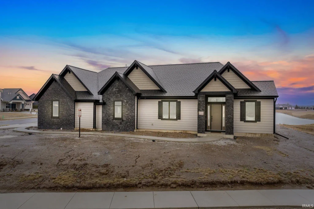 "Brand New Construction" by Bob Buescher Homes. The lot was recently seeded (not shown in pictures), and the home is staged for your viewing. Welcome to this elegant single-story custom-designed Bob Buescher Home, recently completed and beautifully staged. This exquisite residence offers 2,156 square feet of thoughtfully designed living space, paired with a spacious three-car, side-loaded garage spanning 778 square feet. Step through the foyer passing a versatile office/den, then flow into an expansive great room featuring a soaring cathedral ceiling and a refined fireplace. The open-concept layout seamlessly connects the great room to a gourmet kitchen and dining area, perfect for entertaining and family gatherings. The kitchen is a chef’s dream, boasting a 5 x 8 island with MSI Midnight Carbo quartz countertops and a 7-foot deep walk-in pantry for ample storage. The primary suite is a true retreat, complete with a cathedral ceiling and a spa-inspired bathroom featuring a double vanity, linen cabinet, custom tile walk-in shower, private water room, and an impressive 17-foot deep walk-in closet. Two additional spacious bedrooms ensure comfort and privacy for all. Outside, a covered rear porch and open patio provide serene spaces to relax and enjoy stunning views of the nearby body of water, enhanced by the home’s prime corner lot position. The home showcases luxury vinyl plank (LVP) flooring in the foyer, dining area, kitchen, laundry, and great room, with plush carpeting in the bedrooms. Custom white oak and elm wood cabinetry, cultured marble bathroom vanities, and Sherwin-Williams modern gray walls create a sophisticated, contemporary aesthetic. Nestled in the desirable Mercato community, this home offers easy access to shopping, restaurants, and I-469. With its stunning design, premium finishes, and inviting layout, this Bob Buescher Home is a rare find. Don’t miss the chance to make it yours!