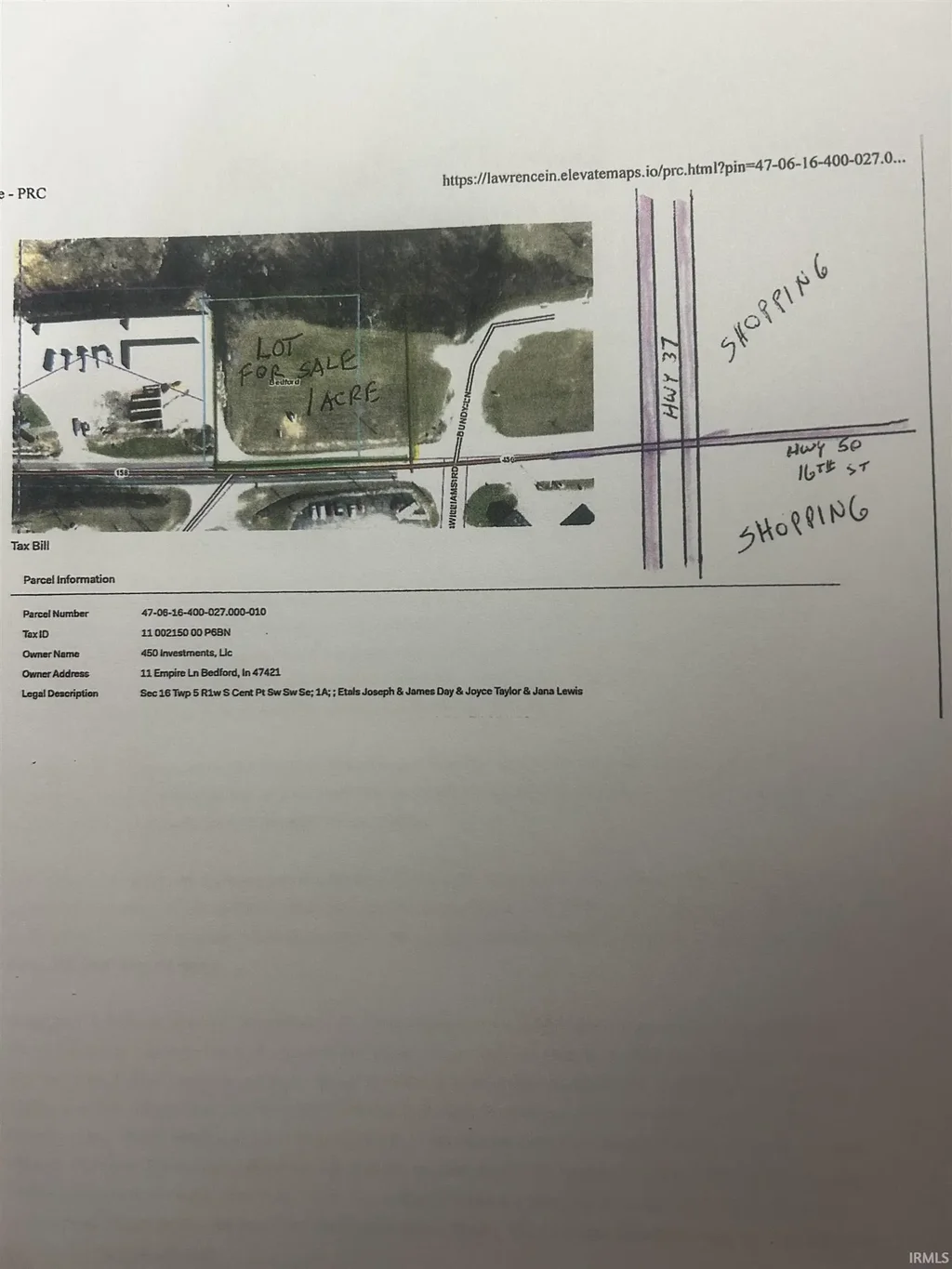 This is a one-acre lot near the busiest intersection in Bedford, Ind., a great place for just about any business. High traffic area with a service station and a surplus store just across the Street, and a huge business district across the highway with many businesses already in place.