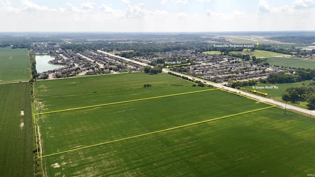 This 12.51+/- acre tract in northern Vanderburgh County represents a well-positioned opportunity within the growing McCutchanville area. Located on the east side of North Green River Road, the property is just north of Kansas Road and situated between Indiana Highway 57 and Interstate 69. The area has seen steady residential and infrastructure expansion, offering a practical setting for future land use considerations. The property includes approximately 430 feet of frontage along the northbound side of N Green River Road. A 40-foot-wide existing driveway approach is already established at the northwest corner, providing convenient access. Roadside utility infrastructure includes 69KV overhead electric service, water and sewer access, and AT&T fiber optic service. The land is currently zoned as vacant, with no deed restrictions, allowing for future flexibility in potential use. The only current lease is an agricultural lease for crop production through the 2025 season. Open tenancy will begin in 2026. Nearly 100 percent of the acreage comprises highly productive Iva silt loam soils, currently being farmed. This soil type is widely regarded for its consistency and fertility, making it well-suited for various agricultural purposes or development site preparation. A public drainage ditch runs along the eastern boundary of the property and serves as a drainage ridge, aiding in water management and runoff control. The surrounding area is a mix of agricultural ground, wooded corridors, and expanding residential neighborhoods. Recent development in McCutchanville and its proximity to Evansville’s north side have created an environment where land like this has become increasingly sought after for long-term use planning. The property’s accessible location near major roadways, availability of full utility services, and high-quality soils make it suitable for those exploring options such as residential subdivision planning, commercial site development, or continued agricultural use. It sits within a development corridor that connects rural and suburban growth trends. This site offers a valuable opportunity for those seeking acreage in a growing community with road access, utilities, and long-term potential in Vanderburgh County.