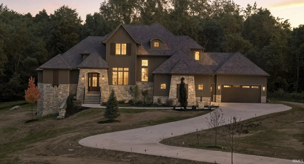 Contingent with First Right of Refusal. Discover unparalleled elegance in this stunning new construction from Timberlin Custom Luxury Homes, nestled in the serene community of Shadow Creek in Huntertown, IN. Located at 17539 Silhouette Trail, this masterpiece spans 5,825 square feet of meticulously designed living space, offering 6 bedrooms, 5.5 bathrooms, and a spacious 4-car garage, all situated on a beautifully finished walkout basement. Step inside to experience a harmonious blend of sophistication and functionality. The heart of the home is its custom kitchen, a chef’s dream featuring top-of-the-line Wolf appliances, a Sub-Zero refrigerator-freezer, a built-in coffee bar, and a butler’s pantry with an additional refrigerator for seamless entertaining. The open-concept great room impresses with a soaring coffered ceiling, creating an airy and inviting atmosphere. In contrast, the nearby hearth room, complete with a second fireplace, offers a cozy retreat for intimate gatherings. The main-level primary suite is a true sanctuary, boasting luxurious finishes and ample space for relaxation. A wood-paneled home office provides a refined space for work or study, blending style with practicality. Upstairs, three generously sized bedrooms offer comfort and privacy, each thoughtfully designed with access to well-appointed bathrooms and additional laundry hookups. The walkout lower level elevates this home to new heights, featuring two additional bedrooms, a versatile recreation area, a family room, a wet bar, and a flexible space perfect for an exercise room or home theater. Unwind in the spa-inspired bathroom, complete with a rejuvenating sauna, creating a private wellness retreat. Outdoor living is equally impressive, with a covered deck featuring retractable screens, perfect for enjoying the scenic surroundings in any season. This home seamlessly combines luxury, comfort, and modern convenience, making it an ideal haven for families and entertainers alike. Don’t miss the opportunity to own this extraordinary Timberlin Custom Luxiry Home, where every detail has been crafted with precision and care. Schedule your private tour today to experience the epitome of luxury living at 17539 Silhouette Trail, Huntertown, IN 46748.