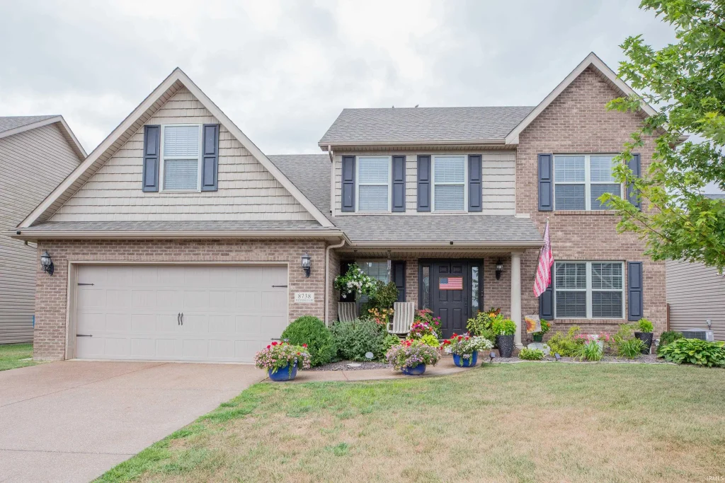 This spacious 4 + bedroom, 2.5-bath two-story home is located on Evansville’s North Side in the Wynnfield subdivision and offers modern updates in a cul-de-sac setting. The tiled entry opens to an inviting floor plan with neutral colors, a large dining room, and a beautifully designed kitchen featuring granite countertops, wood cabinetry, stainless steel appliances, and a breakfast bar that flows into the family room with large windows, built-in bookshelves, and a gas fireplace. The family room opens onto a covered back porch overlooking the fenced yard and yard barn. Upstairs, the primary suite includes, granite-topped vanity, and a spacious walk-in closet, while three additional bedrooms, a full bath, a bonus room, and new vinyl flooring complete the second level. Additional highlights include a 2.5-car garage with tall ceilings, a sprinkler system with separate meter, tankless water heater, and built-in alarm system.