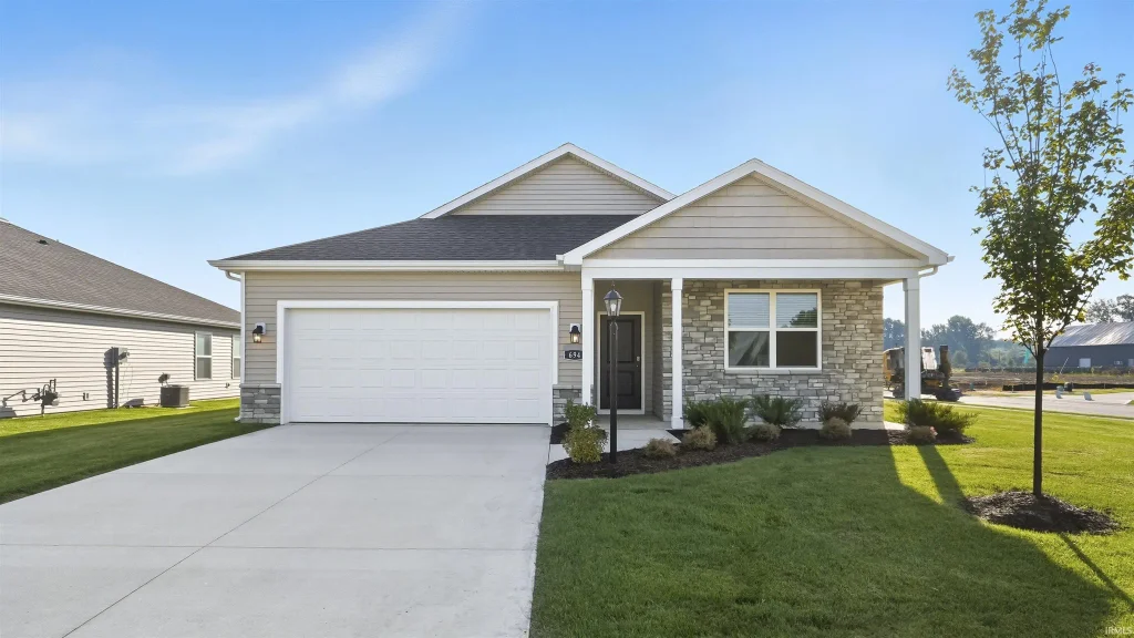 Welcome to 694 Chellberge Pass in New Haven, IN, a stunning new home in our Riverwalk neighborhood. This single-story home sits on a spacious corner lot and featuring 9 foot walls, this home offers a perfect balance of comfort and convenience. You’ll have plenty of room with 4 bedrooms, 2 bathrooms, and 1,771 square feet. As you step through the front door, two secondary bedrooms and a full bathroom are tucked just off the foyer. Continue down the hallway and you’ll find the third secondary bedroom across from the laundry room. At the heart of the home, the great room, dining area, and kitchen are all connected in a spacious open-concept layout ideal for everyday living and entertaining. The kitchen is designed for both beauty and function. It features white cabinetry, miami vena quartz countertops, Dal urban putty backsplash, and stainless steel appliances. The center island includes a built-in sink and dishwasher, making meal prep and cleanup a breeze. A walk-in pantry offers plenty of storage, and the kitchen opens effortlessly to the casual dining area and great room, so you’re always part of the conversation. The private owner’s suite is located at the back of the home for added privacy. It includes a spacious bedroom, a bathroom with dual sinks, a separate ceramic tile walk-in shower, and a large walk-in closet. It’s the perfect retreat at the end of the day, with thoughtful features to keep mornings running smoothly. Ready to make this home yours? Schedule a tour of 694 Chellberge Pass in Riverwalk today and discover why this floor plan is one of our most popular single-story layouts! Photos representative of plan only and may vary as built.