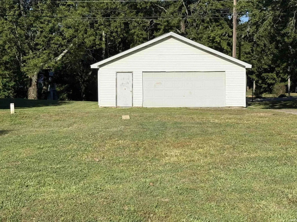 Nice lot with a garage in Economy. The garage is vinyl sided, has a concrete floor and an overhead and walk through door. Garage roof is less than a year old.