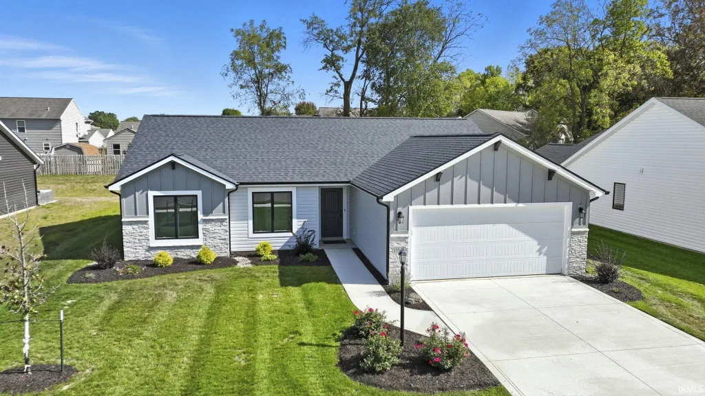 Brand new ranch home by Granite Ridge Builders! This home is located in Northwest Allen County Schools. The exterior of the home has charming curb appeal with board and batten siding along with gable bracket accents. The interior is a clean neutral decor with an open great room and large picture window. The kitchen has custom cabinetry with quartz countertops and composite undermount sink. The kitchen also includes a stainless steel gas range, microwave & dishwasher. The primary suite has a generous closet and larger bathroom wider vanity. This garage is painted, trimmed & has a hybrid polymer garage floor coating. This home includes Andersen high performance windows along with a 2 stage gas furnace and gas water heater for added comfort and affordable utility costs.