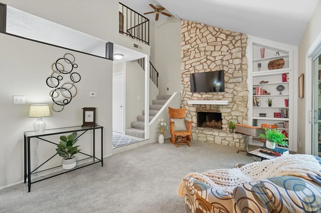 Tucked away in a charming community surrounded by nature, yet just minutes from Stellhorn, Maplecrest, I-69, & Coliseum shopping & dining, this updated home features heated ceramic tile floors, open-concept living, & soaring great room w/ floor-to-ceiling stone fireplace. Gourmet kitchen w/ rich custom D&B Amish cabinets, quartz counters, tiled backsplash, & all appliances included. 3 large glass sliding doors bring the outdoors in w/ natural light & private wooded views. New Furnace/AC 2020! Also, featuring a main-level den, guest bath, & laundry (W/D 2023). Upstairs: primary suite with Juliet balcony, dual closets, & bedroom #2. Bathroom features Copper River cabinetry, crushed granite countertops, & dual sinks. So much character throughout such as transom windows, custom built-ins, & more! Garage w/ pull-down stairs floored attic storage. HOA covers water, sewer, trash, snow, siding, roof. Enjoy the clubhouse & pool during the sunshine months w/ friends and family! Low-maintenance living with natural charm!