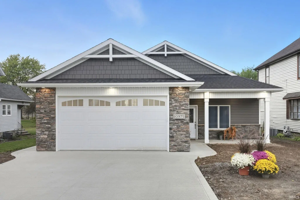 This brand-new home offers modern living with a bright open-concept layout and cathedral ceilings. The spacious kitchen features a large island, stainless steel appliances, and plenty of storage. The kitchen flows seamlessly into the dining and living area with a cozy stone fireplace. The primary suite includes a walk-in closet and private bath, while two additional bedrooms provide space for family, guests, or a home office. Enjoy relaxing on the covered back patio or front porch. With an attached 2-car garage and move-in-ready design, this home combines comfort, style, and small-town charm.