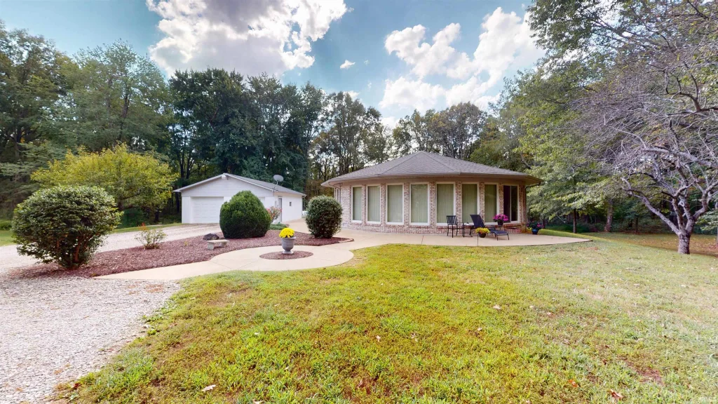 Welcome to 5155 Oak Tree Dr - a truly unique circular brick ranch nestled on 17 picturesque acres in Boonville, just 10 minutes from Newburgh's everyday conveniences. This beautifully maintained 2-bed, 1-bath home features an open floor plan bathed in natural light, with panoramic views offered by full walls of glass windows and doors stretching around the home’s circular footprint. Take a virtual stroll through this home with our 3D Matterport tour! Nearly the entire perimeter of the home is wrapped in concrete patios - perfect for entertaining or simply enjoying the peaceful, wooded surroundings. Inside, the Jack-and-Jill full bath features dual vanities with access from both the hallway and the primary bedroom. The kitchen features a central island with bar seating and an adjacent dining area. Outdoors, you'll find a 30x50 pole barn with dual overhead doors and an attached 15x50 lean-to overlooking the woods - an ideal spot for outdoor gatherings or additional covered storage. A 2.5-car detached garage, located just steps from the home, features 100-amp electric service and garage door openers on both bays. One of the three parcels - 10 acres - is enrolled in the Indiana Classified Forest & Wildlands Program, ideal for hunters or conservation-minded buyers. Recent updates include a new roof on the home and garage (2018), furnace (2019), and water heater (approx. 4 years old). Offering both privacy and versatility, this rural haven is perfect for outdoor enthusiasts, hobbyists, or anyone seeking a peaceful retreat close to town. Seller is providing a $575 AHS home warranty at closing.