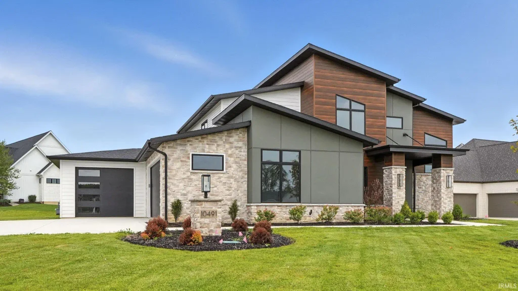 Luxury Modern New Construction Home in Leo, Indiana – by Timberlin Homes. OPEN SUNDAYS from 1-4 pm! Discover the pinnacle of contemporary luxury with this brand-new modern home by Timberlin Homes, located in the sought-after Leo, Indiana community. Designed for elegance and functionality, this upscale residence showcases high-end finishes, open-concept living, and premium craftsmanship throughout. Sophisticated Design & Premium Features - Step into an expansive light-filled living area featuring floor-to-ceiling windows and a striking stone fireplace with floating built-in shelves—the perfect blend of style and comfort. The gourmet kitchen is a chef’s dream, boasting a top-tier Monogram appliance package, custom cabinetry, natural stone countertops, and a handcrafted zinc range hood. A walk-in pantry with extensive shelving provides ample storage, ensuring organization and efficiency. Indoor-Outdoor Living at Its Best - The dining area opens through 8’ double sliding doors to a covered veranda, offering a seamless transition to outdoor living. The primary suite also enjoys veranda access, enhancing the connection to nature. This luxurious retreat features a spa-like ensuite with a tiled walk-in shower with rain head, a soaking tub, and an expansive walk-in closet. Flexible & Spacious Layout - A main-level flex room offers versatility—perfect for a home office, study, or cozy sitting area. Upstairs, three additional bedrooms provide generous space, while a bonus room serves as a potential fourth bedroom, media room, or entertainment space. Smart Home Technology & Modern Conveniences - This home is designed for effortless luxury living, featuring a comprehensive security system, high-quality sound system, and an efficient irrigation system. Thoughtful details, including custom lockers in the laundry room, enhance both style and functionality. Embrace the perfect blend of modern design, comfort, and smart-home innovation in this stunning Leo, Indiana new construction home. Schedule your private tour today!
