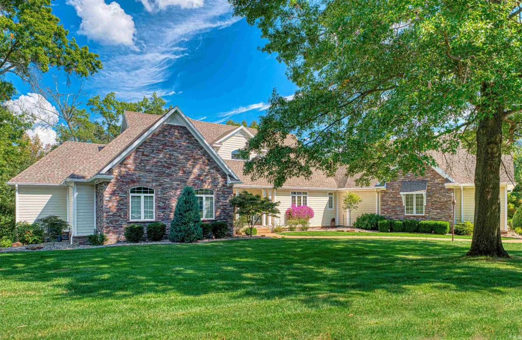 Situated on 2.58 +/- acres with a private lake in McCutchanville, this one-owner custom built home offers space, luxury, and privacy complete with 4 bedrooms, 5 full/2 half baths, and a quality finished walk-out lower level. This thoughtfully designed home offers a floor plan for relaxing and entertaining with expansive living areas on three levels. The foyer opens to a sitting area with built-ins and a great room featuring a stunning stone fireplace with custom cabinetry and a wall of windows with French doors leading to a balcony-style deck. The gourmet kitchen includes an abundance of custom cabinetry, a 6-burner gas range, double ovens, large island with prep sink, walk-in pantry, and more. The spacious dining room offers custom built-ins with window seat & shelving with doors opening to a screened porch, deck, and patio with views of the lake for outdoor entertaining. The main-level owners’ suite is a retreat, with dual ensuite baths, walk-through shower, separate vanities and commodes, jetted tub, and two large walk-in closets with custom shelving. Two additional main level bedrooms feature a Jack & Jill bath. The back entry wing with staircase to the bonus room offers a mudroom, guest bath, and a large laundry room with sink and an abundance of cabinetry and counter space. The large bonus room offers many opportunities with a full bath. The lower level adds a family room with wet bar plumbing, home office area, bedroom with walk-in closet, and a full bath. The lower level also offers an additional 876 +/- unfinished square feet including a large workshop room with pet wash station and sink, a lawn equipment garage with overhead door, and two large storage rooms. The oversized 3.5-car side-load garage and expansive drive provide ample parking. With private stocked lake, gorgeous grounds, and thoughtful design throughout, this stunning home is ready for a new family to enjoy.